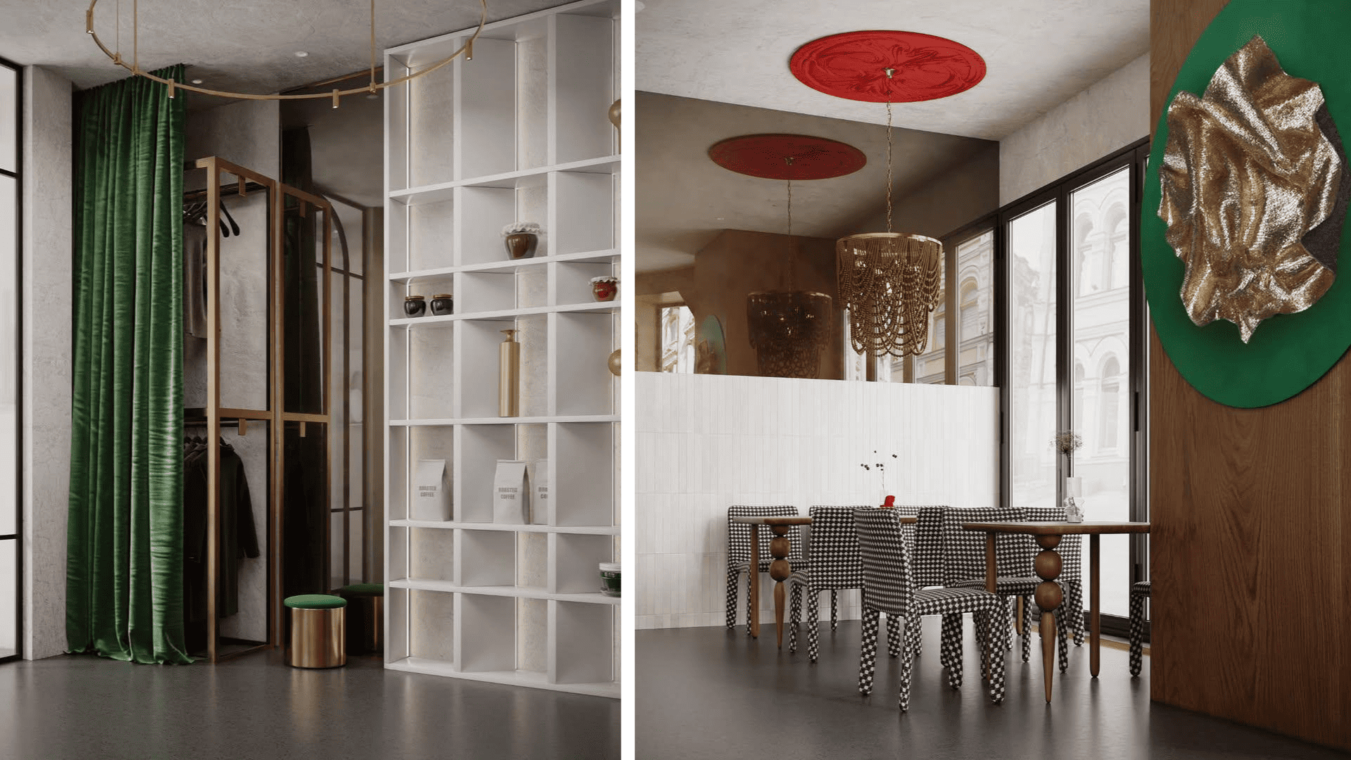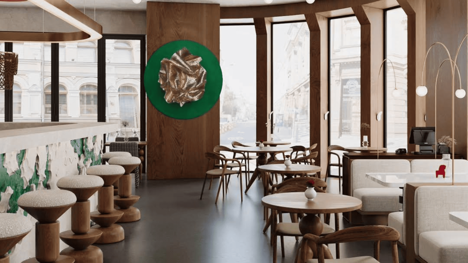 Здание, в котором находится заведение, реконструировано в начале 20 века в стиле модерн. Архитектурой уже заложено много света в интерьере и округлые формы пространства, что дизайнеры и подчеркнули:
