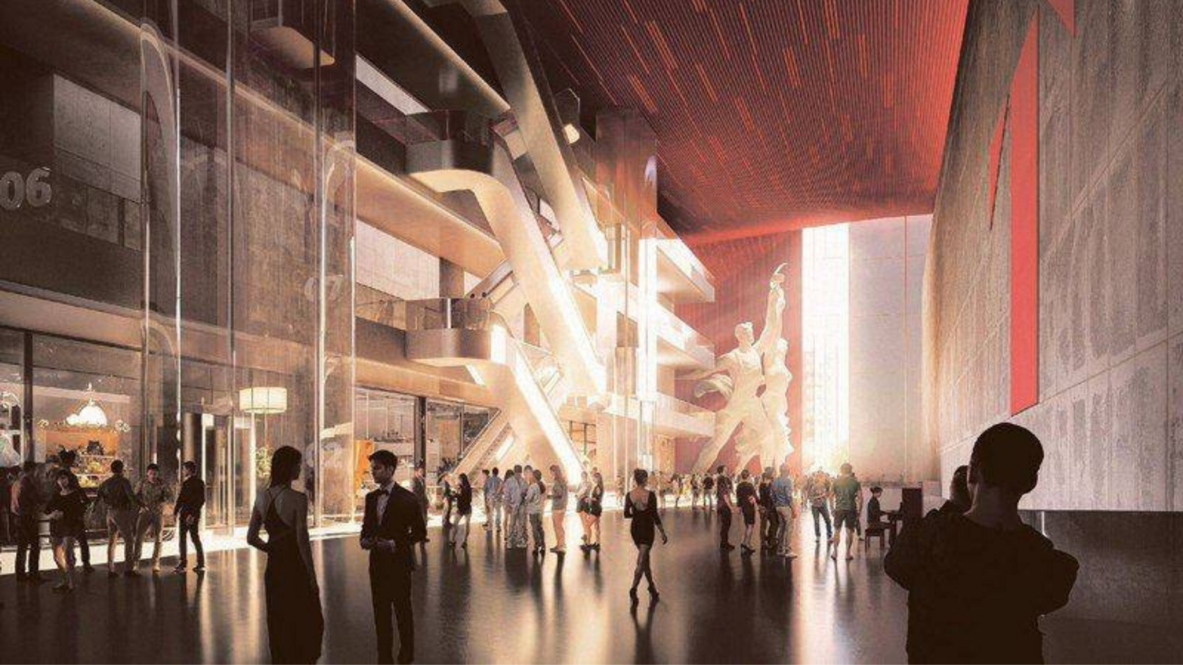 Архитектура – скульптурный объём в авангардном красном керамическом багете, материал прочный и выразительный. Медиаэкраны добавят динамики, при этом форма остаётся лаконичной.