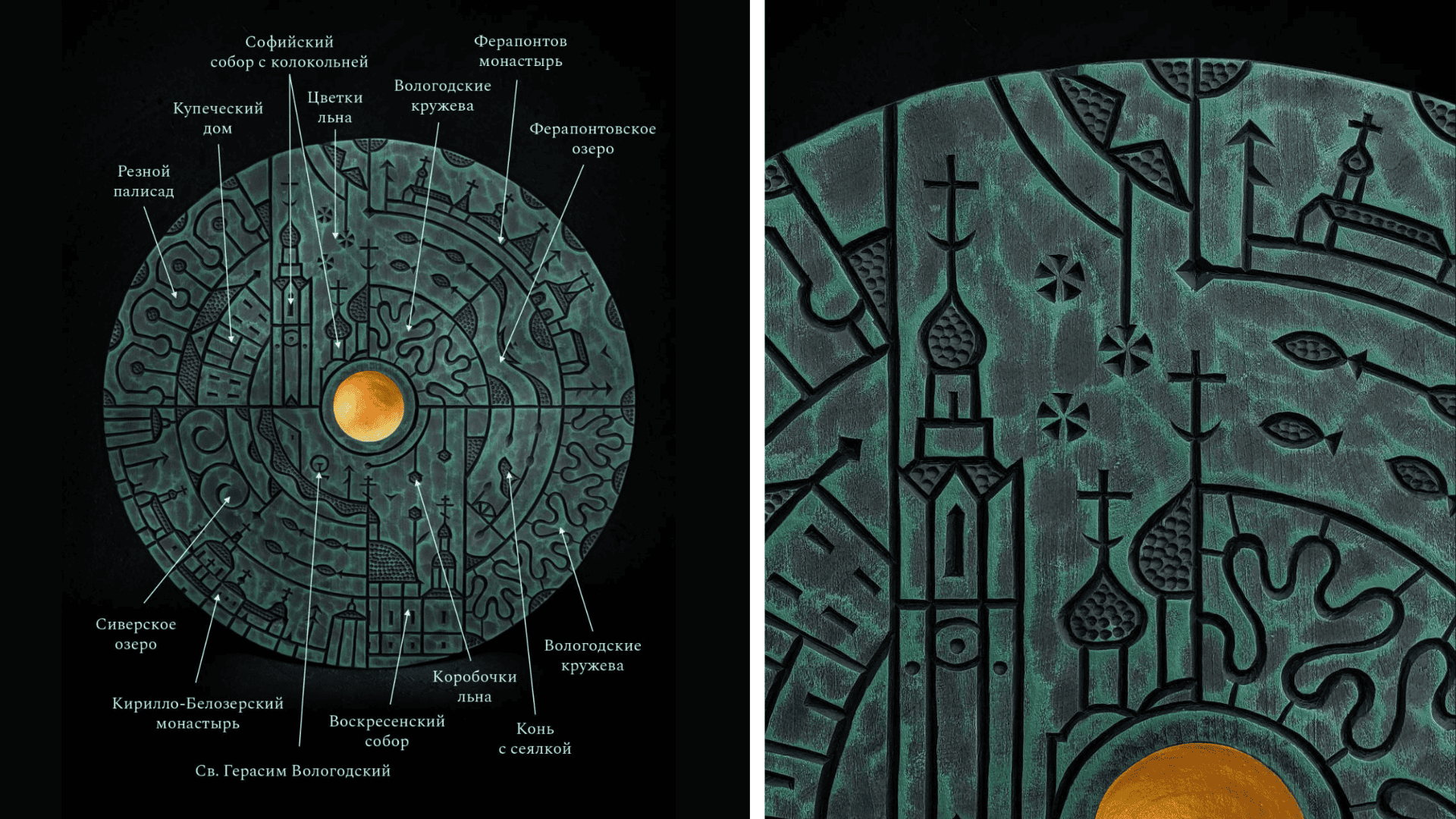 В рисунке резьбы можно узнать контуры Спасо-Преображенского собора Рыбинска, Воскресенский храм затопленного города Мологи, колокольню и купола Софийского собора Вологды, а также многие другие значимые здания и символы, связанные с возникновением и развитием этих двух древних городов.