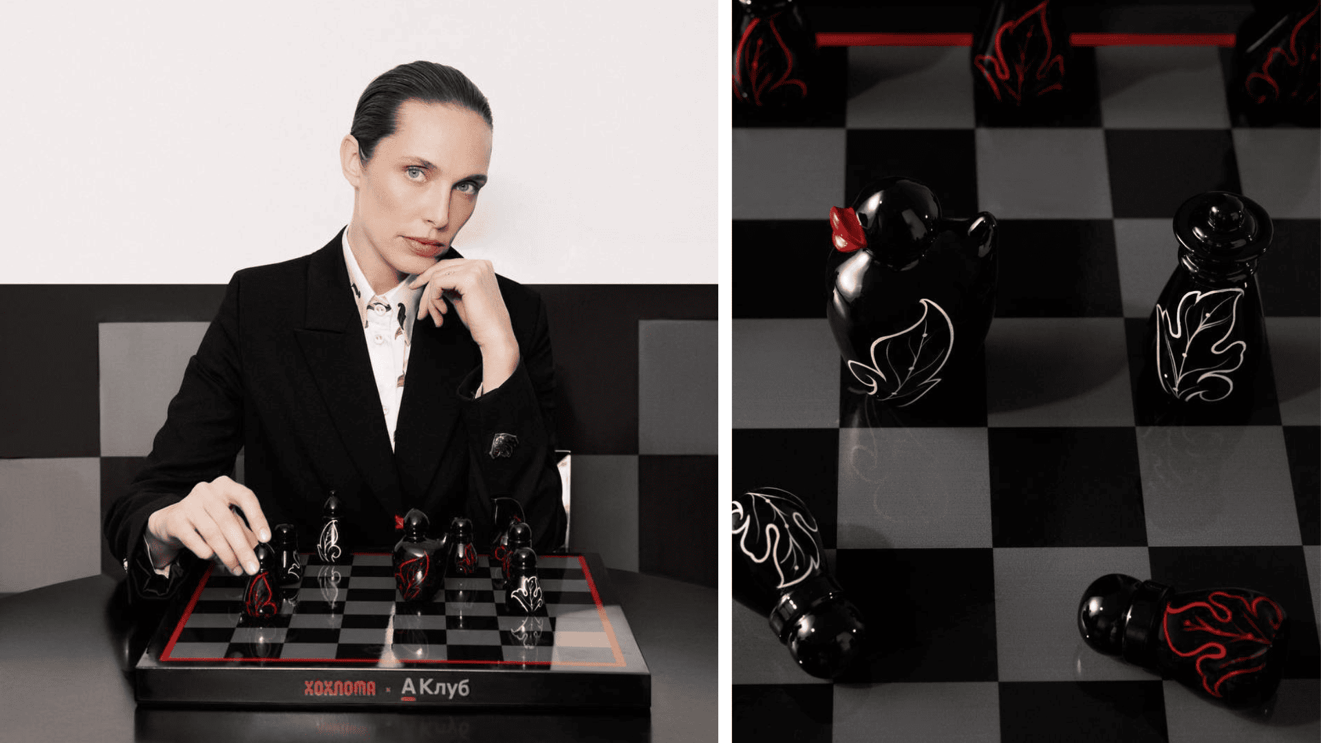 Шахматные фигуры изготовлены вручную из липы и березы на фабрике «Хохломская роспись» в Семёнове. Вместо короля на поле — черная уточка.